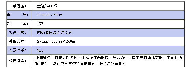 仪器符合GB/T3536;GB/T267;ASTMD92标准,适用于测定石油产品的闪点和燃点,但不适用于测定燃料油的开口闪点低于79℃石油产品。仪器采用固态调压器,用调节旋钮调节电炉电压从而实现按标准要求的升温速度。
