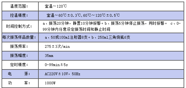 仪器满足于《GB/T259-88石油产品水溶性酸及碱测定法》、《GB/T7598-87运行中变压器油汽轮机油水溶性酸(比色法)》、《SD304-89绝缘油中溶解气体组分含量测定法(气相色谱法)》以及其他理化实验中的恒温定时振荡。该仪器采用电热丝加热,同时采用了PID控制的自动渐进加热方式,保证了较高的控温精度,并根据不同的实验要求,设置了多种工作方式程序,方便了操作。